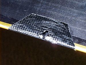 The repaired area was lightly sanded to remove excess epoxy. Small gaps round the edges of the section were filled with Polyfilla spackle and sanded to match the wing surface contour because such imperfections will show through the covering. The wing was masked off so only the repaired area was exposed, misted with 3M Spraymount and a piece of aluminised Mylar smoothed into place after the Spraymount had time to go tacky. The mylar patch must overlap the edges of the original mylar or the margins of the repair will be painfully visible when the repair is complete.